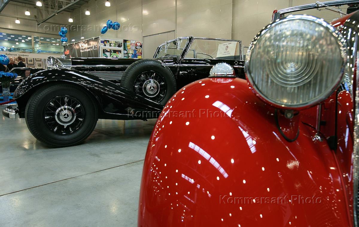Церемония открытия выставки старинных автомобилей и технического антиквариата "ХII Олдтаймер-Галерея Ильи Сорокина" в выставочном центре "Крокус Экспо". Эмблема компании Mersedes-Benz на капоте автомобиля "Мерседес".
