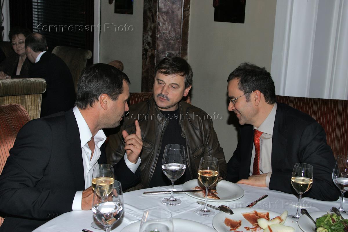 Слева направо: председатель правления "Альфа-банка" Рушан Хвесюк, генеральный директор холдинга "Объединенные кондитеры" Артем Кузнецов и губернатор Тверской области Дмитрий Зеленин на ужине от Ассоциации менеджеров в честь лидеров рейтинга "Лучший менеджер - 2008". Ужин прошел в ресторане "Горки".