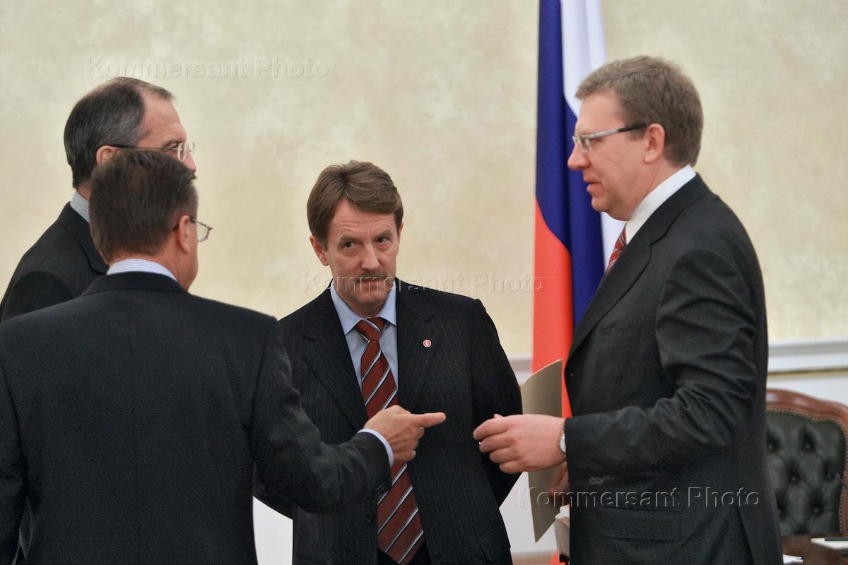 Слева направо: министр иностранных дел России Сергей Лавров, министр сельского хозяйства России Алексей Гордеев и заместитель председателя правительства России, министр финансов России Алексей Кудрин на заседании президиума правительства России. Заседание состоялось в Доме правительства.