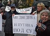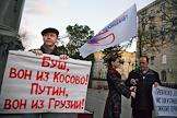 Активисты московскиого отделения ОГФ совместно с правозащитными организациями провели пикет против агрессивных действий российских войск на территории Грузии. Мероприяия прошли на Чистопрудном бульваре около памятника А. С. Грибоедову. Участник акции держит плакат "Буш, вон из Косово! Путин, вон из Грузии!".