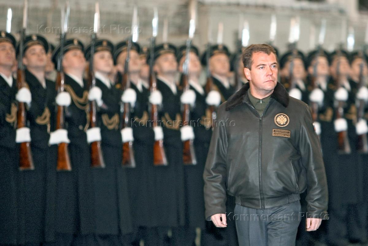 Президент России Дмитрий Медведев на борту авианесущего крейсера "Адмирал флота Советского Союза Н.Г. Кузнецов" в Баренцевом море во время тактических учений сил Северного флота "Двина". Президенту продемонстрировали корабельный истребитель "Су-33", предназначенный для уничтожения средств воздушного нападения противника.