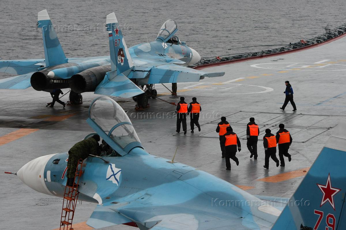 Su-33 fighters on the "Admiral Kuznetsov" heavy aircraft carrying cruiser during "Dvina" tactical maneuvers of the Northern fleet in Barents sea.
