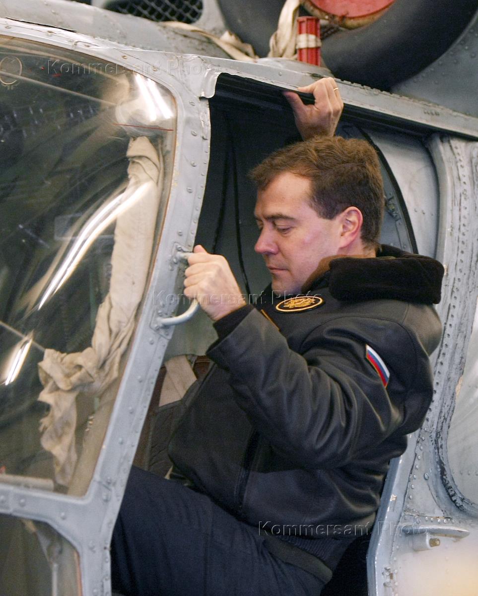 The president of Russia Dmitry Medvedev (at the left) onboard an aviabearing cruiser "Admiral N.G. Kuznetsov" in Barents sea during tactical maneuvers "Dvina" of Northern fleet. Ship fighter "Su-33" have shown to the president.
