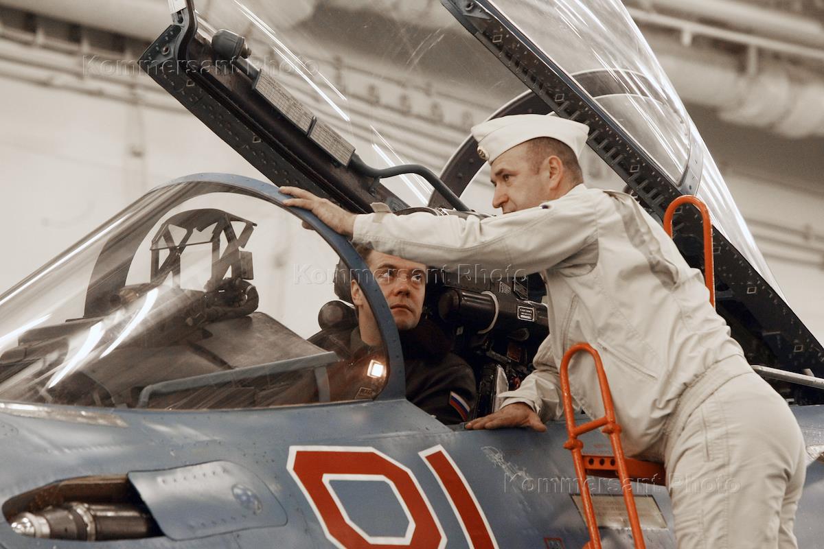 The president of Russia Dmitry Medvedev (at the left) onboard an aviabearing cruiser "Admiral N.G. Kuznetsov" in Barents sea during tactical maneuvers "Dvina" of Northern fleet. Ship fighter "Su-33" have shown to the president.
