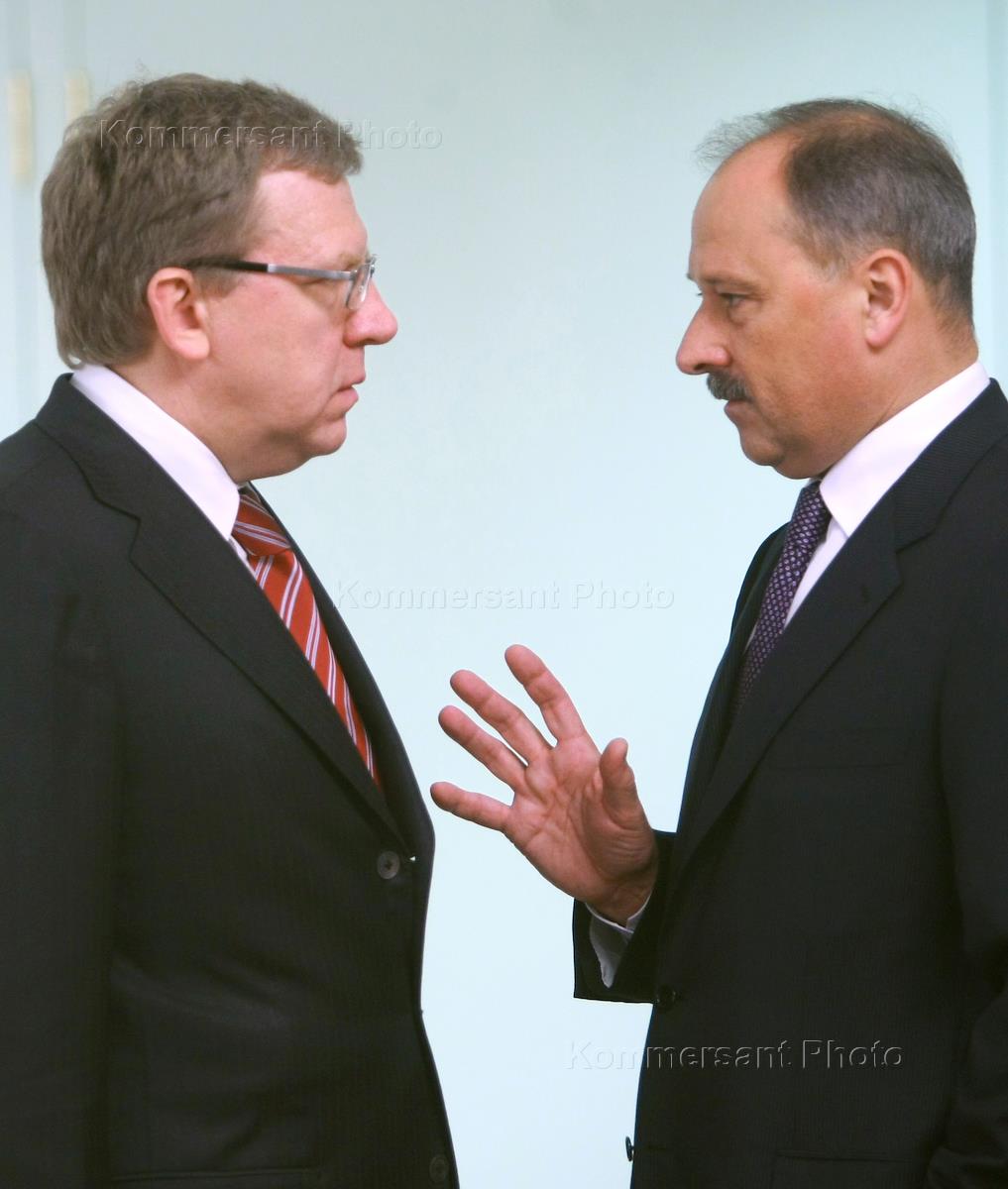 Minister of finance of Russia Aleksey Kudrin (left) and chairman of the Vneshekonombank Vladimir Dmitriyev (right) before the start of the meeting of the Vneshekonombank supervisory board under chairmanship of Vladimir Putin.