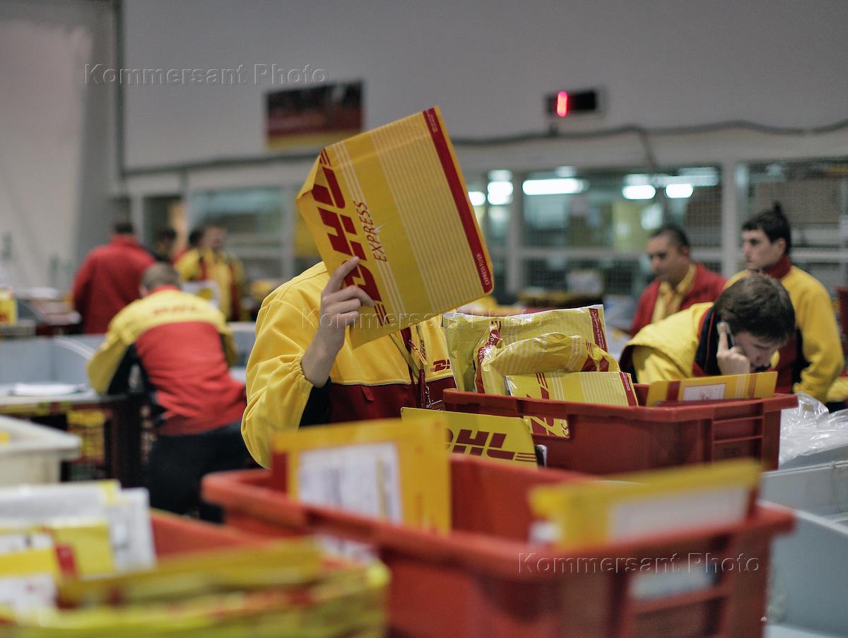 Сотрудники компании DHL - международной сети экспресс-доставки документов, посылок и грузов, во время работы.
