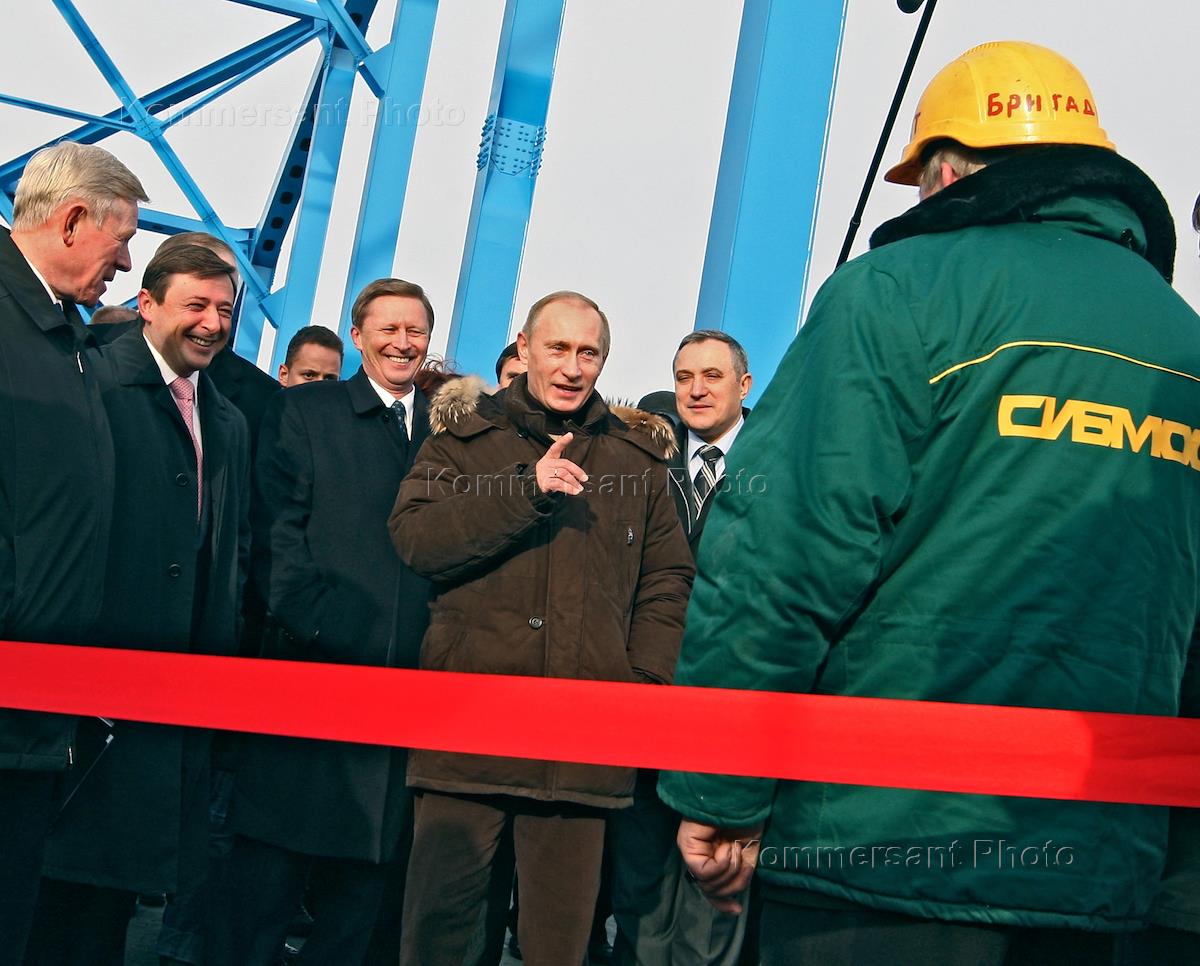 Russian Prime Minister Vladimir Putin during his official visit to Siberia. From left to right: Anatoly Perminov, the Head of the Federal Space Agency, Alexander Hloponin, governor of Krasnoyarsk Region, Sergey Ivanov, Deputy Prime Minister of Russia and Prime Minister Vladimir Putin (center) at the opening ceremony of the bridge over Yenisey River.