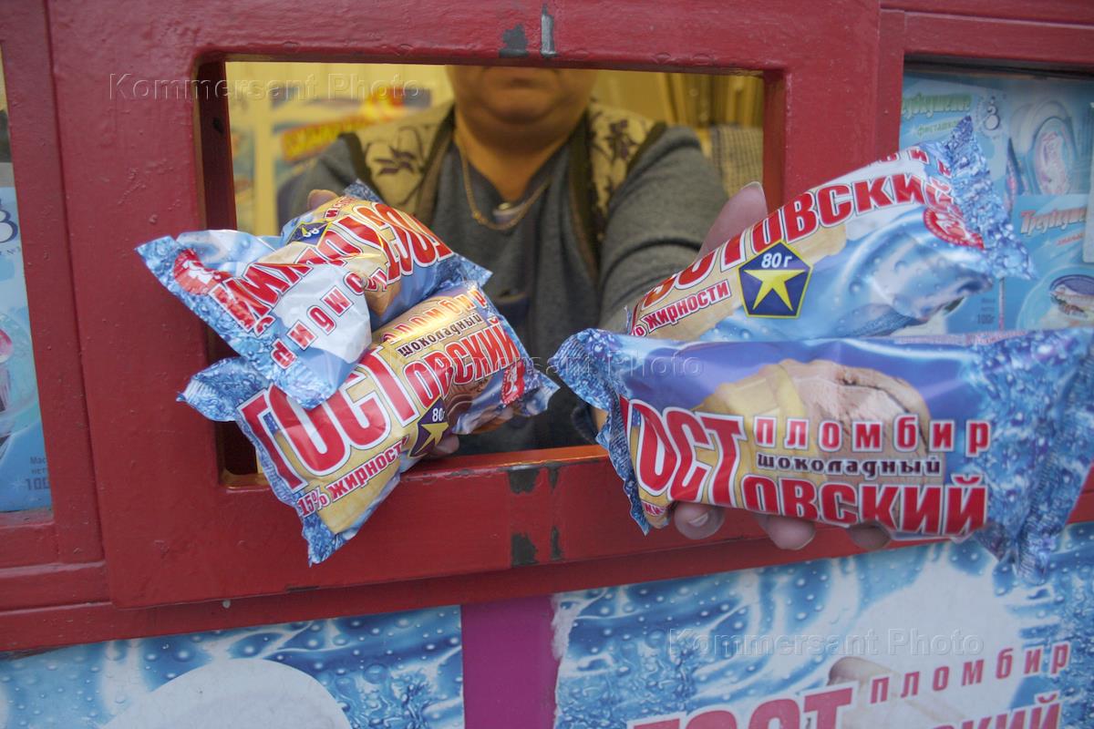 Киоск "Мороженое". Продавец с пломбиром "ГОСТовский" в руках.