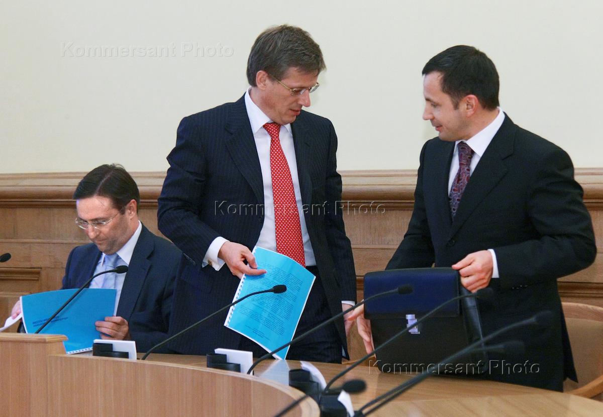Left to right: 1st deputy director general of the "Russian Technologies" state corporation Aleksey Alyoshin, financial deputy director general of Rostehnologii Igor Zavyalov and chairman of board of directors of Vnukovo airport Vitaly Vantsev at the press conference on reorganization of the new aviation alliance "Airlines of Russia", stakes of which were obtained by Moscow government and "Russian Technologies". The press conference took place at the Moscow city hall.