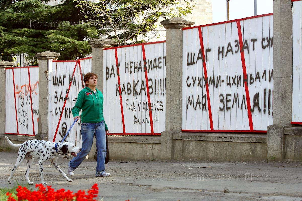 Anti-war inscriptions on a fence "Step back bitches. Sukhumi and Tshinval - my land!" near Russian embassy in Georgia.