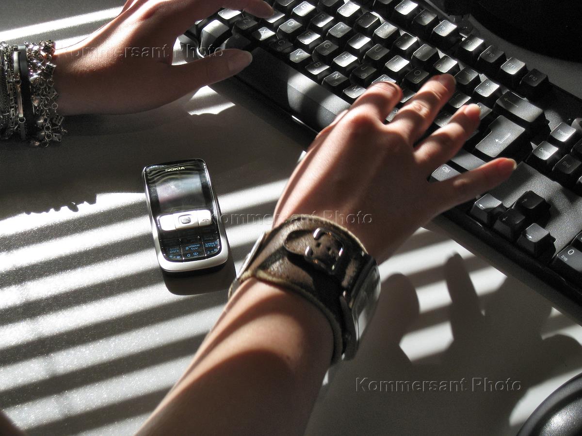 Женские руки на компьютерной клавиатуре и тень от жалюзи.