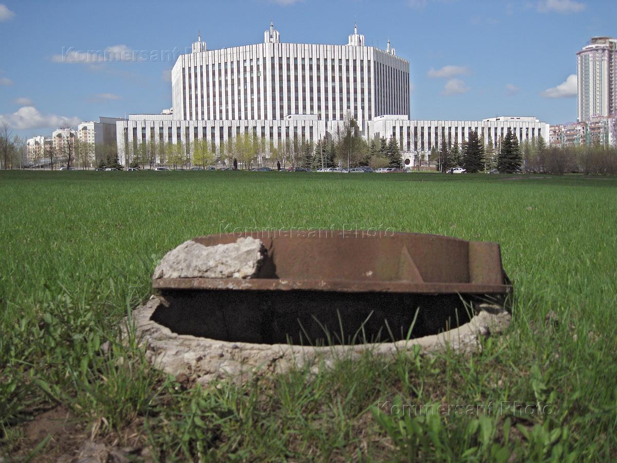 Жанровая фотография. Открытый канализационный люк на фоне здания Военной академии Генерального штаба Вооруженных Сил России.