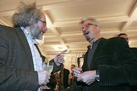 Главный редактор радиостанции "Эхо Москвы" Алексей Венедиктов (слева) и писатель Эдуард Лимонов (справа) на праздновании дня рождения радиостанции "Эхо Москвы" в ресторане "Прага".