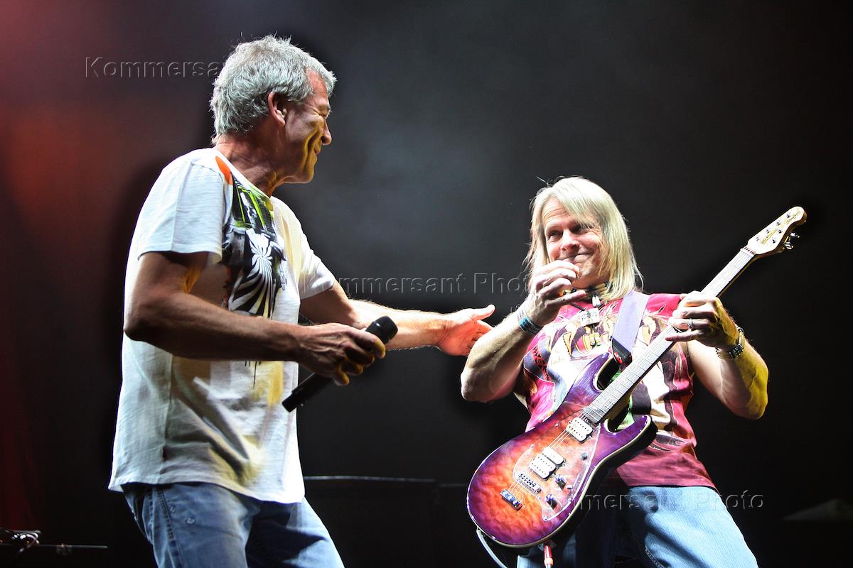 Лидер английской группы Deep Purple Ян Гиллан (слева) и гитарист Стив Морс (справа) во время выступления на концерте рок-группы в спорткомплексе "Олимпийский".