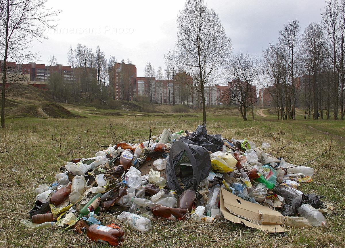 Жанровое фото. Куча бытового мусора в городском парке.