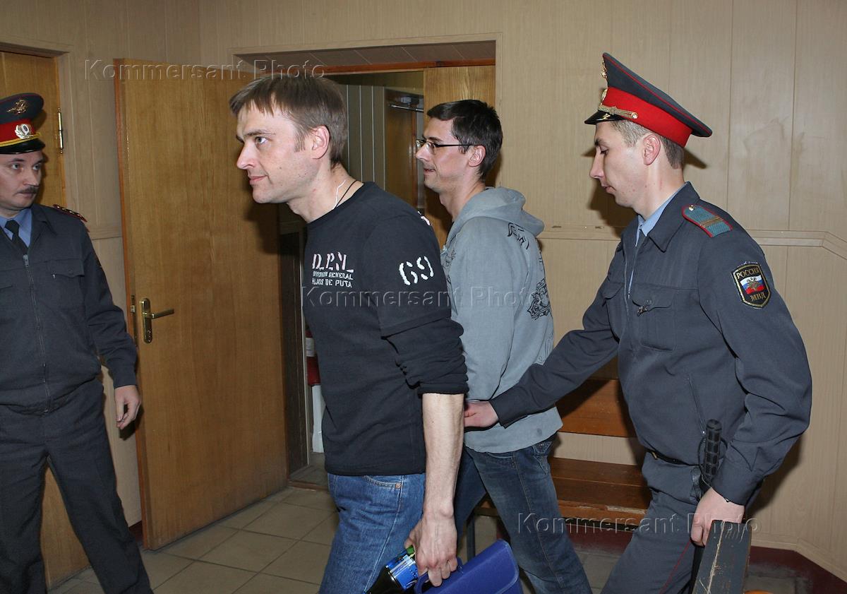 Бывшие заместители председателя правления банка "Нефтяной" Андрей Салимов (слева) и Станислав Прасолов (в центре) перед рассмотрением уголовного дела банка "Нефтяной" в Таганском районном суде. Подсудимые обвиняются в незаконной банковской деятельности и отмывании денег.