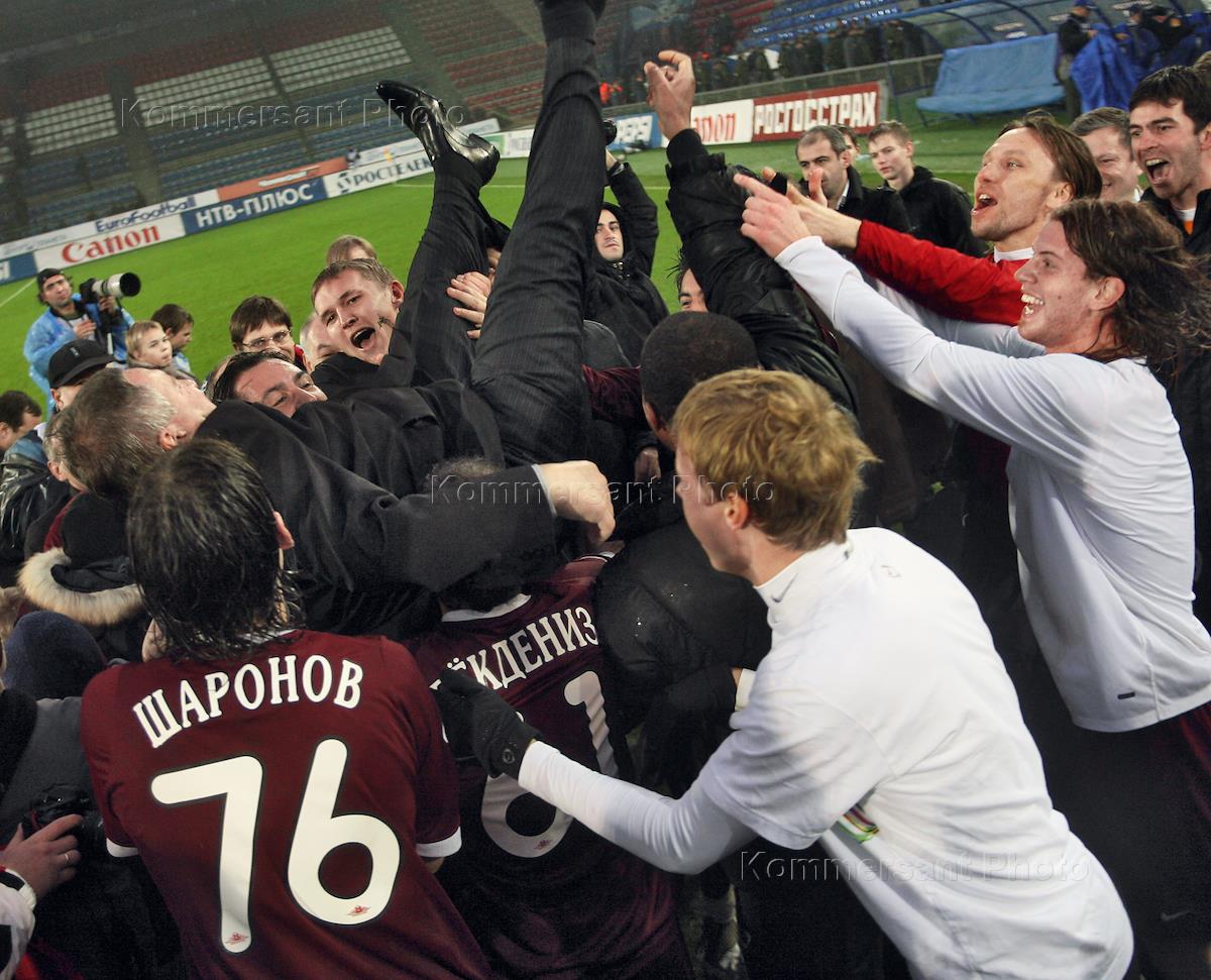27th round of the Russian football championship. Footballers of the Rubin (Kazan) celebrate the victory. The game between FC Saturn and FC Rubin took place at the Saturn stadium.