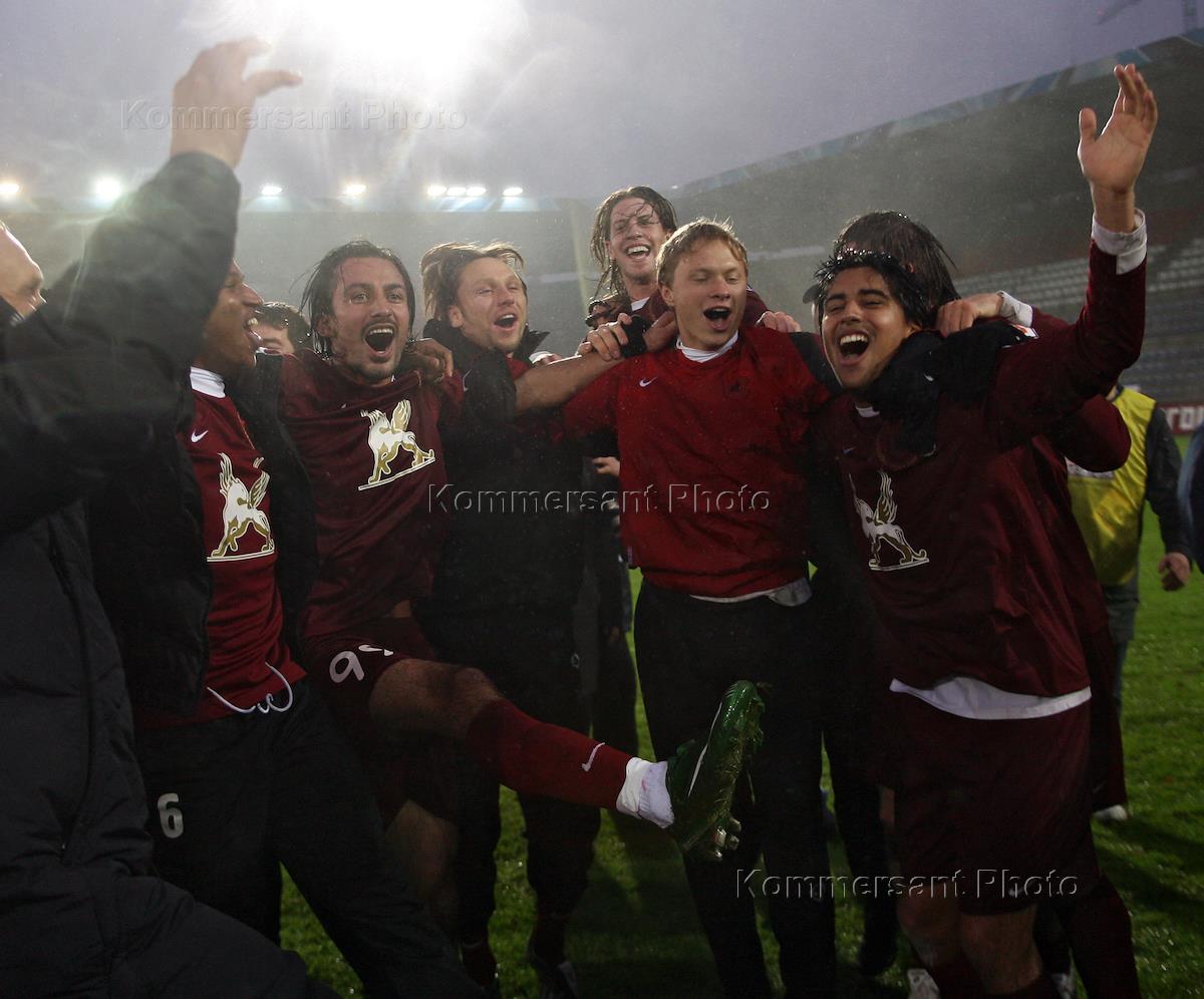 27th round of the Russian football championship. Footballers of the Rubin (Kazan) celebrate the victory. The game between FC Saturn and FC Rubin took place at the Saturn stadium.