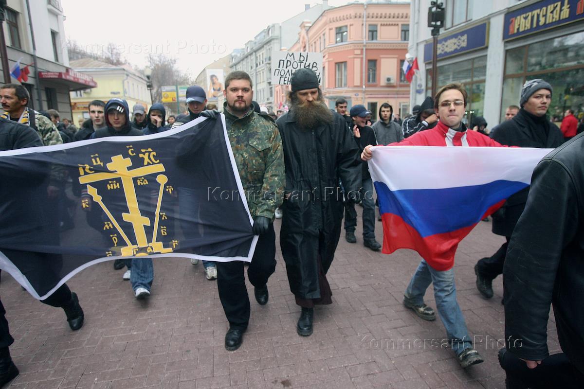 Участники несанкционированной акции "Русский Марш" прошли с флагами и плакатами по пешеходной улице Старый Арбат. Милиция задержала нарушителей правопорядка и доставила в отделы внутренних дел.