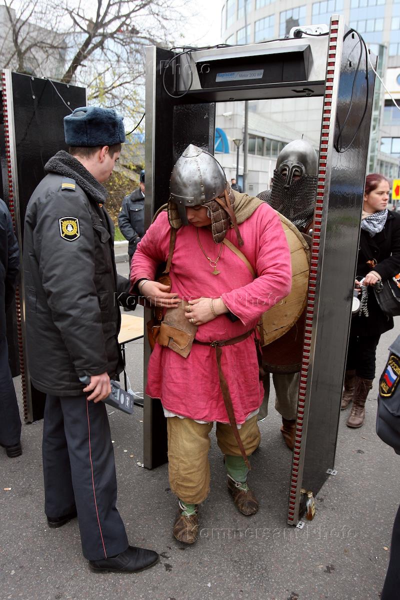 Участники "Русского марша", организованного партией "Народный союз" и движением "Русский образ", прошел на набережной Тараса Шевченко. Сотрудники милиции осматривают участников акции с помощью металлоискателей.