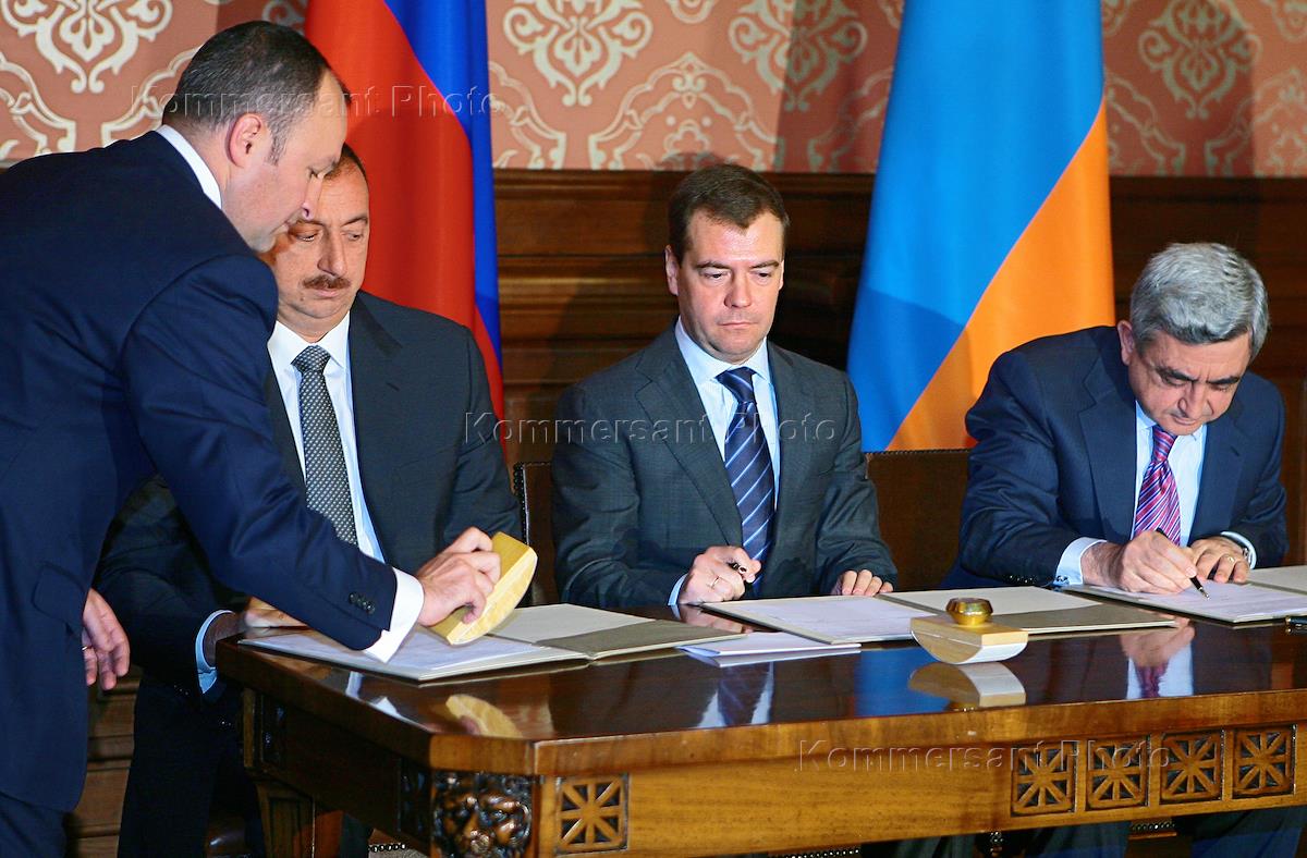 President of Russia Dmitry Medvedev (center), President of Azerbaijan Ilham Aliyev (2nd left) and President of Armenia Serzh Sargsyan before sign the declaration on the outcome of the reconciliation talks about Nagorno-Karabakh Republic. The talks took place at the Meiendorf presidential residence.