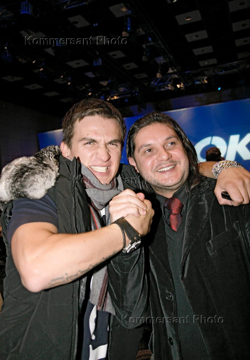 Российская неделя моды (Russian Fashion Week (RFW). Певец Влад Топалов (слева) и участник группы "ПМ" Вячеслав Бодолика (справа) на показе новой коллекции итальянского дизайнера Алессандро де Бенедетти (Alessandro de Benedetti).
