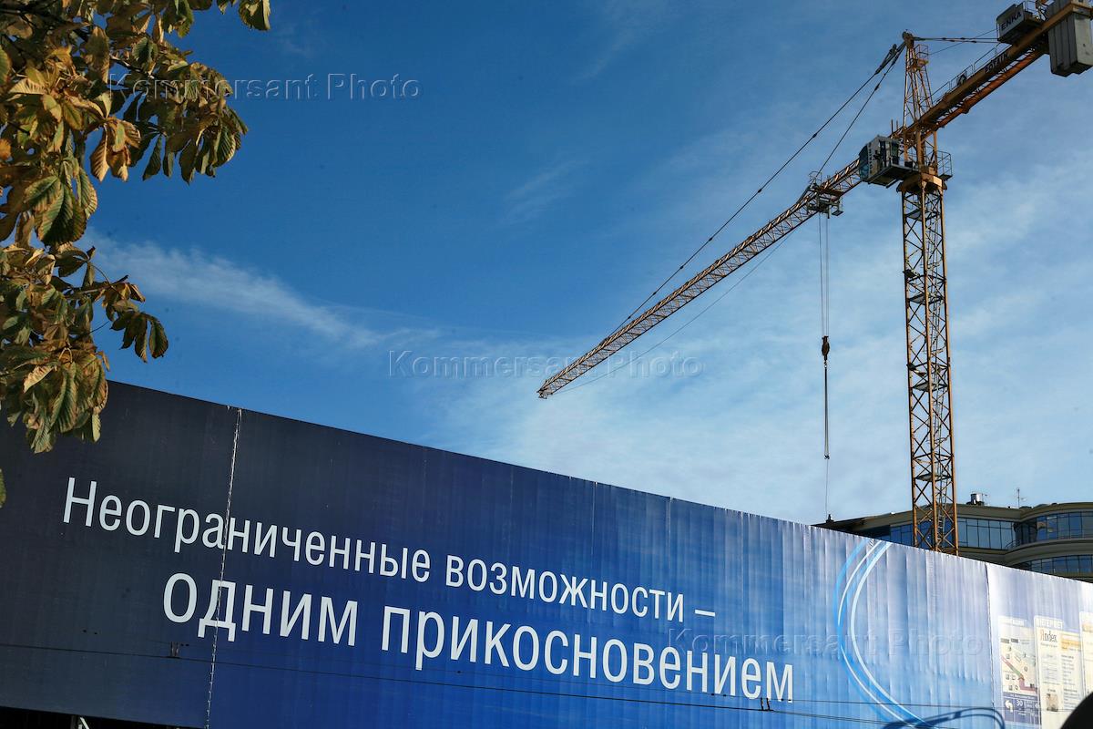 Жанровая фотография. Рекламный плакат "Неограниченные возможности - одним прикосновением!" на фоне строительного башенного крана.