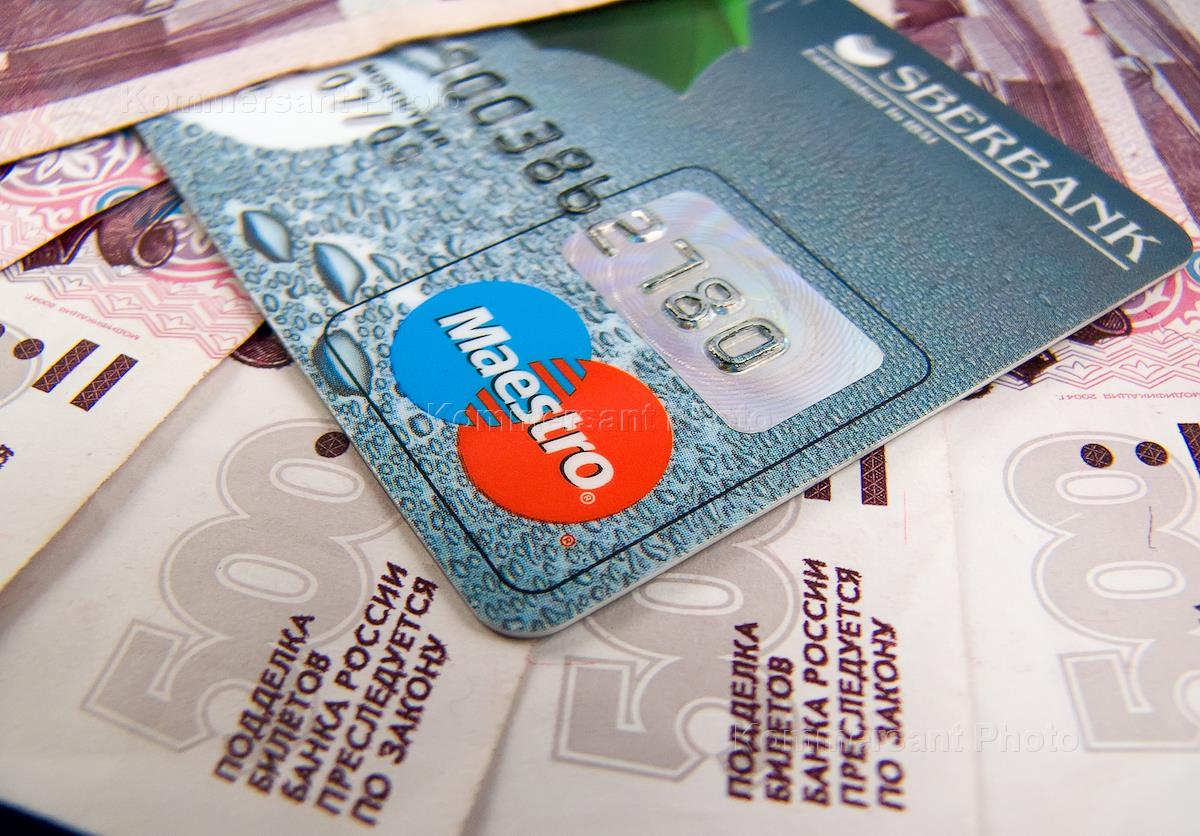 Жанровая фотография. Кредитная карта Сбербанка Maestro лежит на купюрах в 500 рублей.