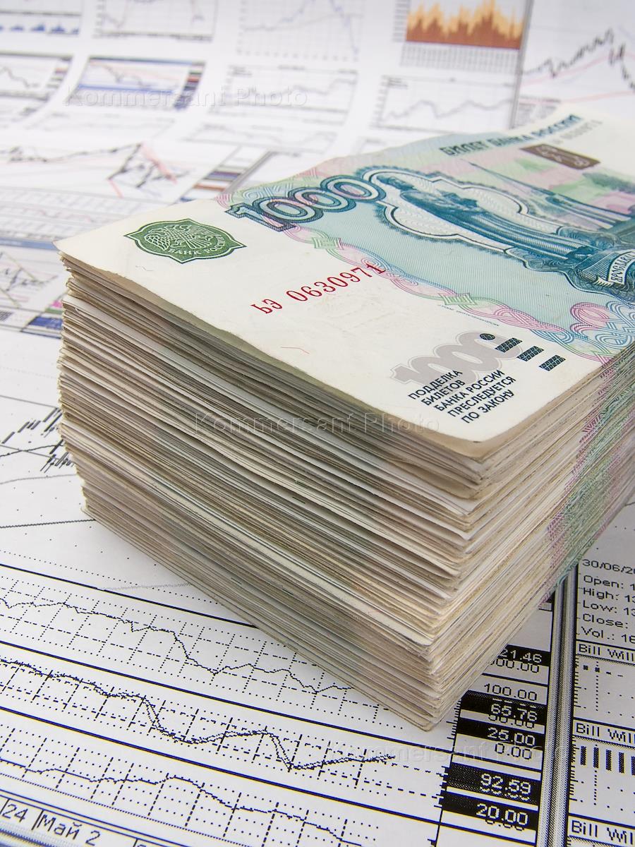 Жанровая фотография. Пачки купюр в 1000 рублей на графиках изменения биржевых индексов и котировок акций.
