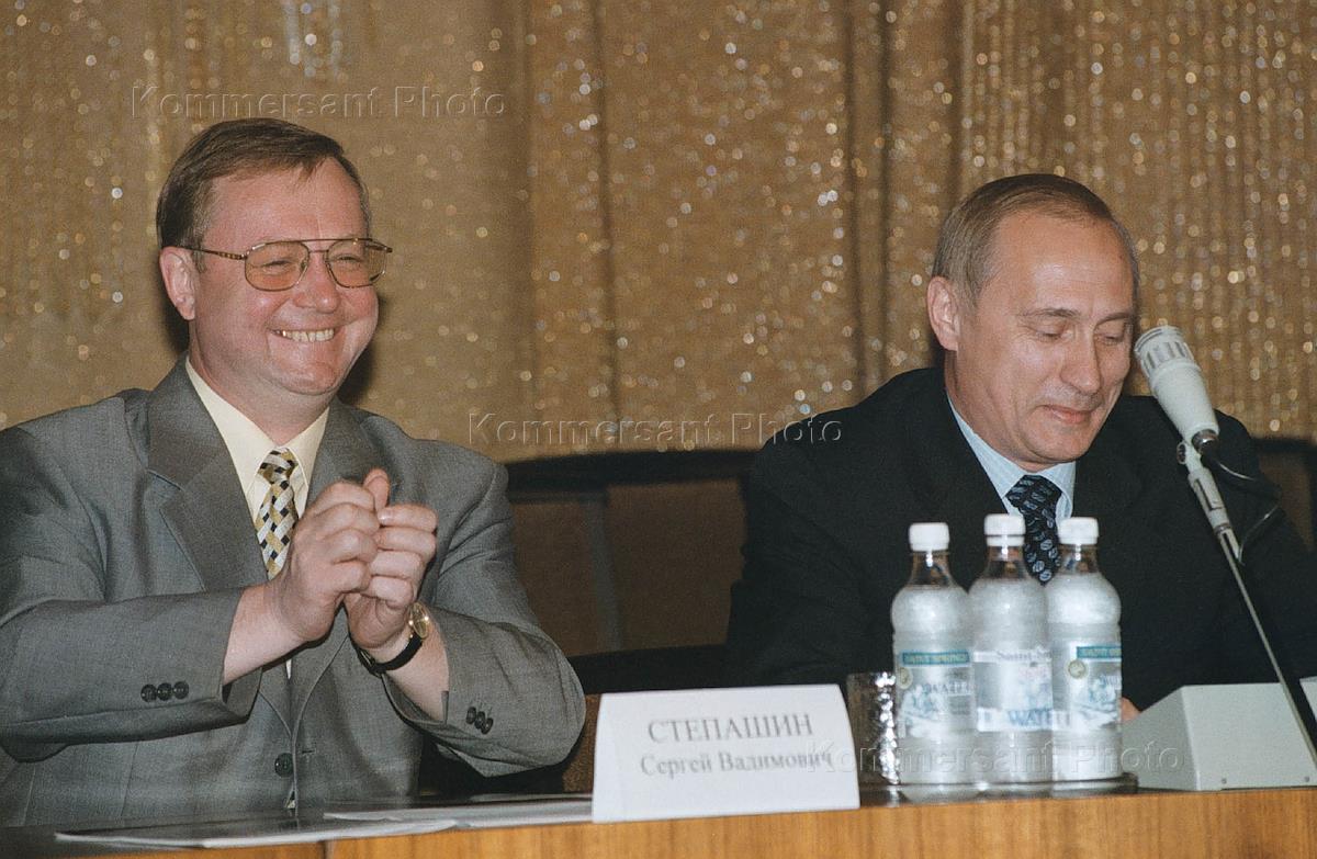 Russian Prime Minister Sergei Stepashin and Director of the Federal Security Service Vladimir Putin at a meeting of the Security Council.
