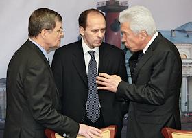 Слева направо: полномочный представитель Президента России в Северо-Западном федеральном округе Илья Клебанов, министр внутренних дел России Рашид Нургалиев, министр юстиции России Александр Коновалов перед началом совещания по вопросам правоохранительной деятельности в России.