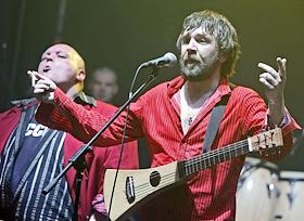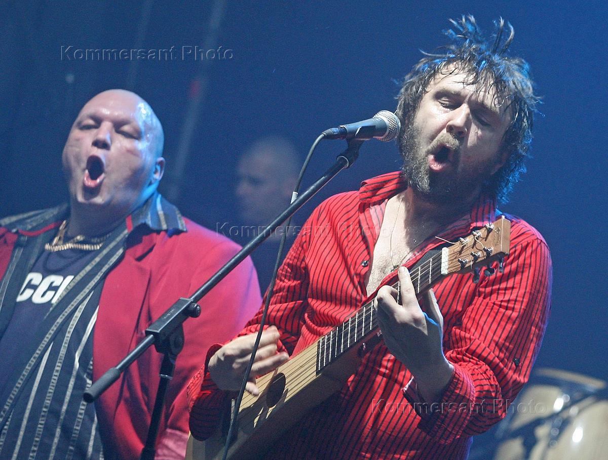 Солисты группы "Ленинград" Стас Борецкий (слева) и Сергей Шнуров (справа) во время концерта "Залп Авроры" на открытии клуба "Главclub".