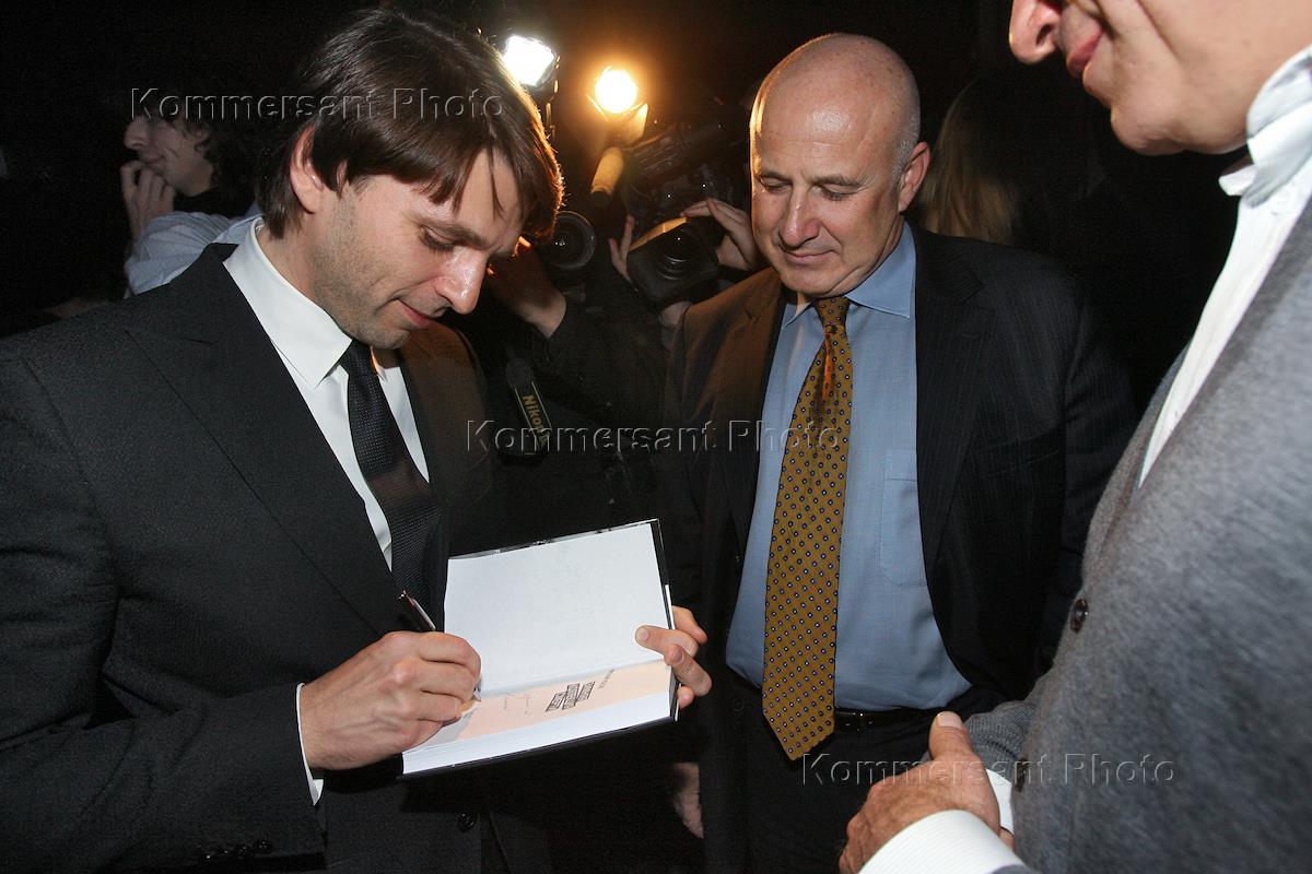 Журналист Евгений Киселев (слева) на презентации книги главного редактора журнала GQ Николая Ускова (справа) "Зимняя коллекция смерти. Fashion-детектив". Презентация прошла в галерее "Триумф".