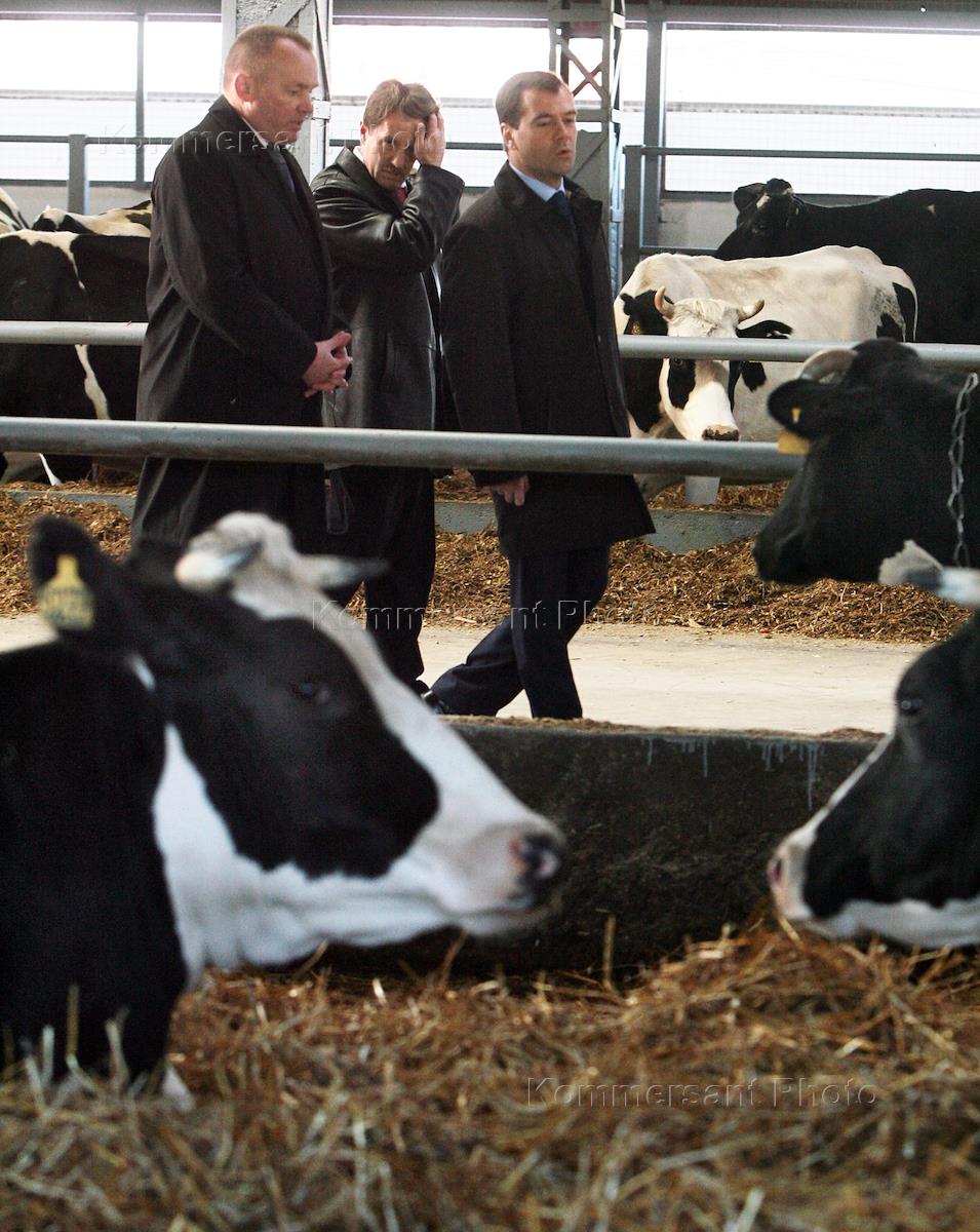Слева направо: председатель совета директоров ОАО "Агропромышленный парк" Александр Чуенко, президент России Дмитрий Медведев и министр сельского хозяйства России Алексей Гордеев во время посещения фермы для содержания крупного рогатого скота компании "АгроПарк" в селе Рогачево.