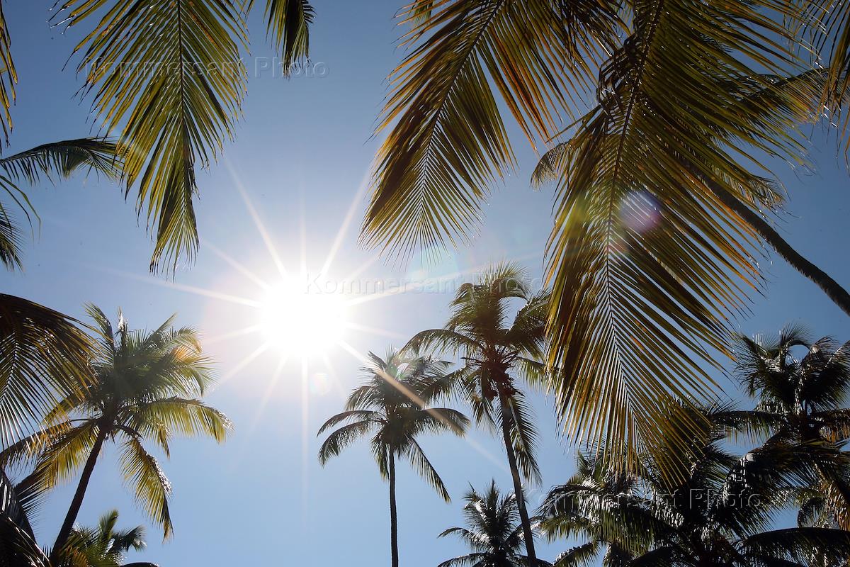 Солнце сквозь пальмы на пляже.