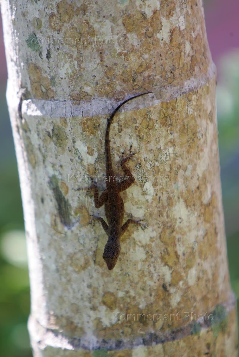 Ящерица на стволе дерева.