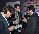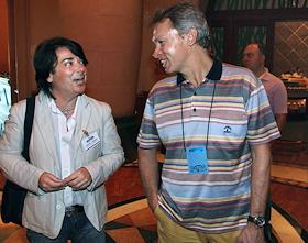 Международный инвестиционный форум Russia Investment Roadshow. Главный редактор журнала "Финанс" Олег Анисимов (слева) и председатель совета директоров компании "Тинькофф. Кредитные системы" Олег Тиньков (справа) в перерыве пленарного заседания форума в отеле "Атлантис".