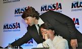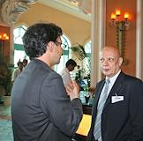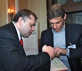 Международный инвестиционный форум Russia Investment Roadshow. Модельер Валентин Юдашкин (слева) и политический обозреватель Алексей Пушков (справа) в перерыве пленарного заседания форума в отеле "Атлантис".