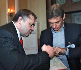 Международный инвестиционный форум Russia Investment Roadshow. Генеральный директор компании Eventica Саймон Джозеф (слева) и заместитель министра иностранных дел России Александр Салтанов (справа) в перерыве пленарного заседания форума в отеле "Атлантис".