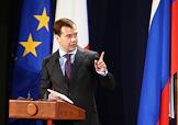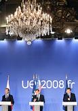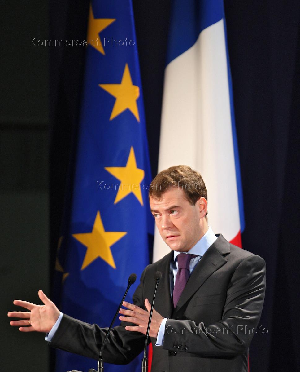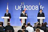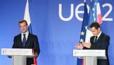 22-й саммит Россия–Евросоюз. Слева направо: президент России Дмитрий Медведев, президент Франции Николя Саркози и глава Еврокомиссии Жозе Мануэль Баррозу во время совместной пресс-конференции.