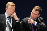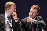 Директор ГК "Российская корпорация нанотехнологий" Анатолий Чубайс (слева) и президент России Дмитрий Медведев (справа) на заседании Круглого стола промышленников России и Европейского союза.