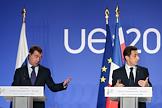 22-й саммит Россия–Евросоюз. Президент России Дмитрий Медведев (слева) и президент Франции Николя Саркози (справа) во время совместной пресс-конференции.