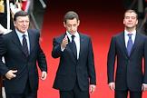 Слева направо: глава Еврокомиссии Жозе Мануэль Баррозу, президент Франции Николя Саркози и президент России Дмитрий Медведев во время 22-ого саммита Россия–Евросоюз.