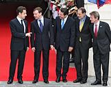 Слева направо: президент Франции Николя Саркози, президент России Дмитрий Медведев, мэр Ниццы Кристиан Эстроси, генеральный секретарь совета Европейского союза Хавьер Солана и министр иностранных дел Франции Бернар Кушнер во время 22-ого саммита Россия–Евросоюз.