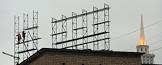 Рабочие во время сварочных работ при монтаже рекламной световой вывески на крыше жилого дома.