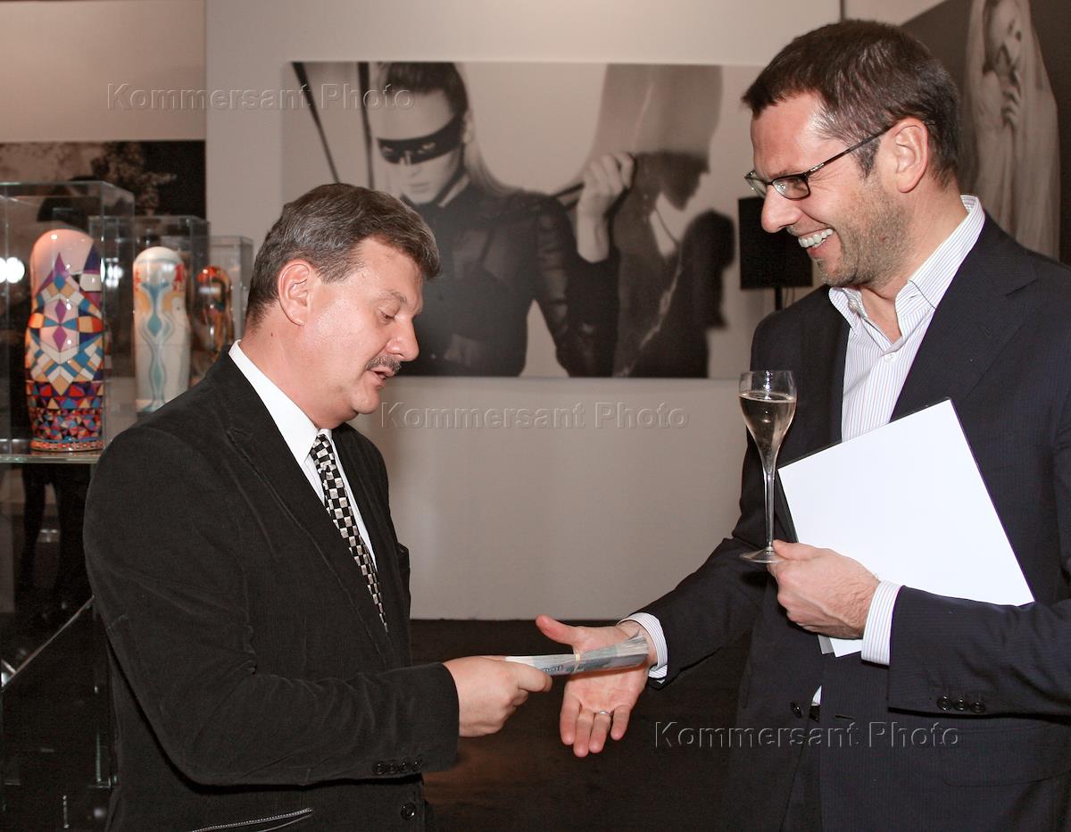 Главный редактор журнала GQ Николай Усков (слева) и совладелец компании "Дымовское колбасное производство" Вадим Дымов (справа) во время благотворительного аукциона, посвященного 10-летию журнала "Vogue" в России. Аукцион прошел в Малом Манеже.