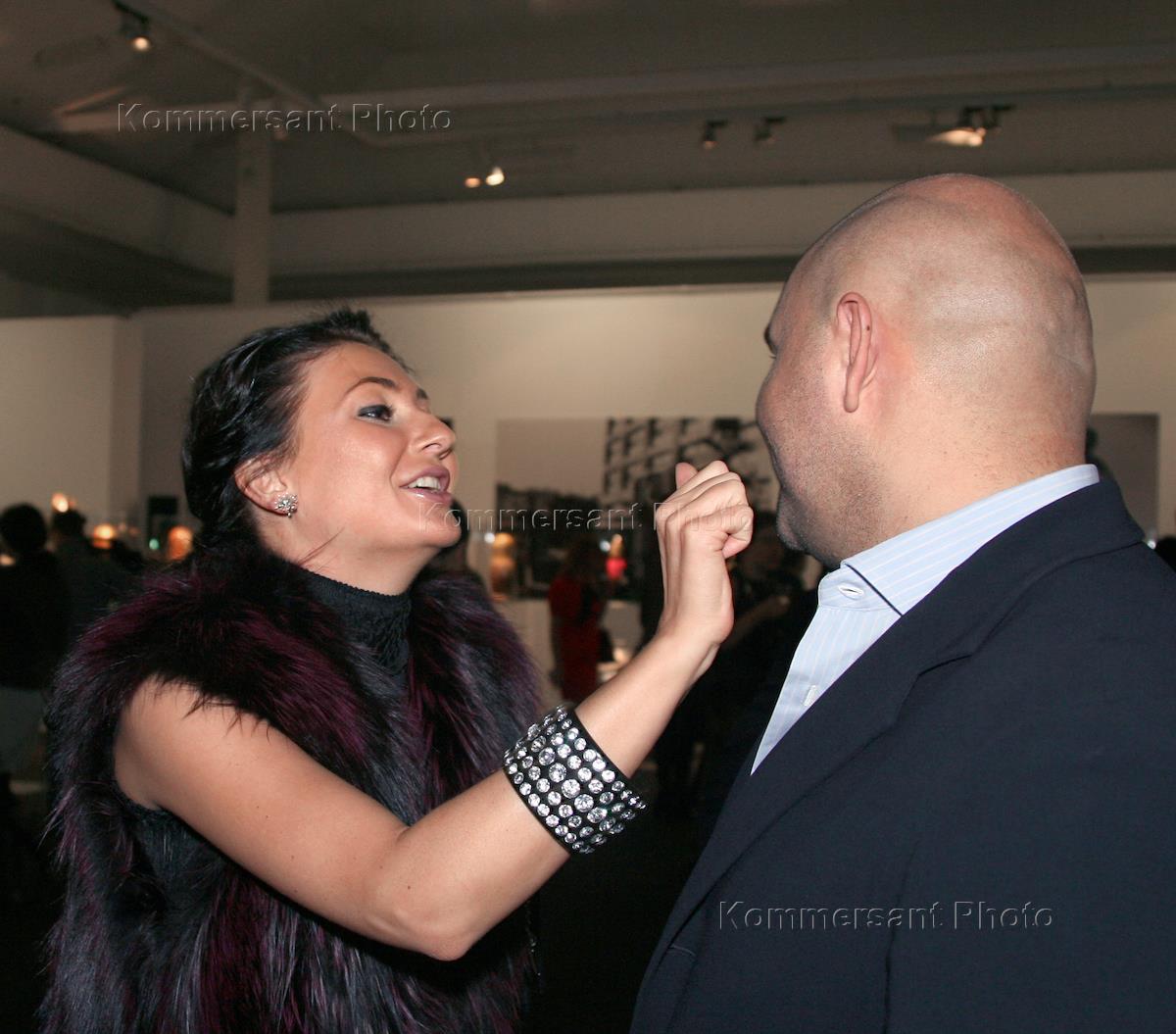 Певица, солистка группы "Аквааэробика" Саша Фролова (слева) и модельер Андрей Бартенев (справа) во время благотворительного аукциона, посвященного 10-летию журнала "Vogue" в России. Аукцион прошел в Малом Манеже.
