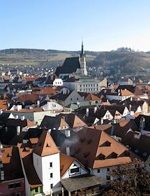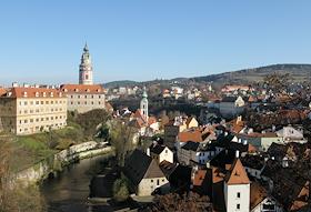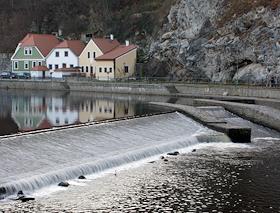 Старинные домики на берегу мельничной плотины на реке Влтава.