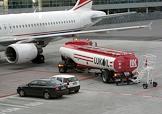 Топливозаправщик компании "Лукойл" заправляет самолет "Аэробус А-320" в аэропорту Рузине.