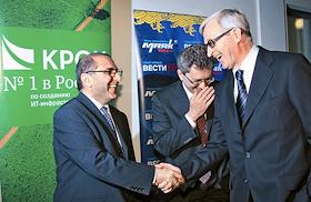 Президент Ассоциации Банков Центральной России Гарегин Тосунян (слева) и президент Московской международной валютной биржи (ММВБ) Константин Корищенко (справа) перед началом церемонии вручения премии журнала "Итоги" "День Банкира 2008" в гостинице "Балчуг Кемпински".